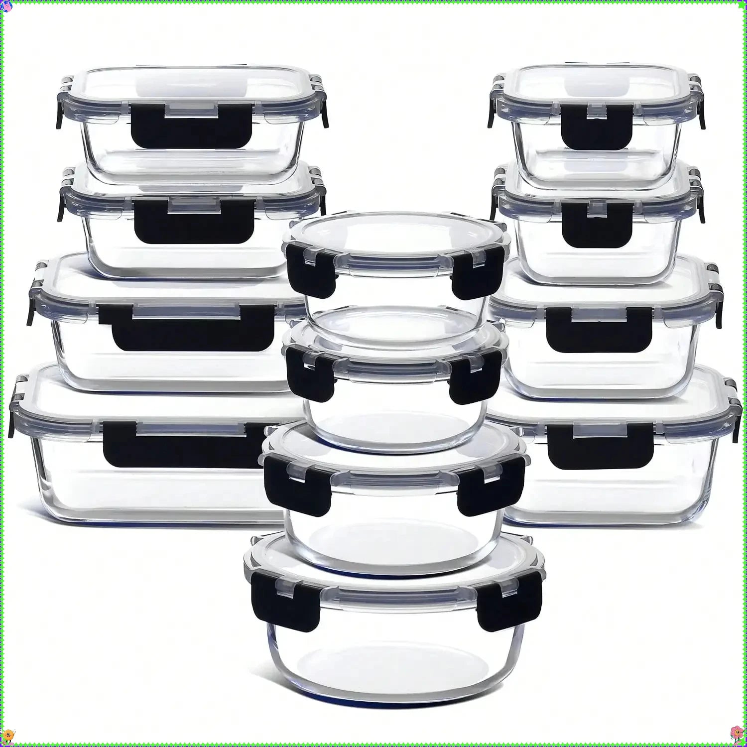 12-piece set of glass food storage containers with lids, airtight leak-proof glass lunch boxes, various sizes and shapes